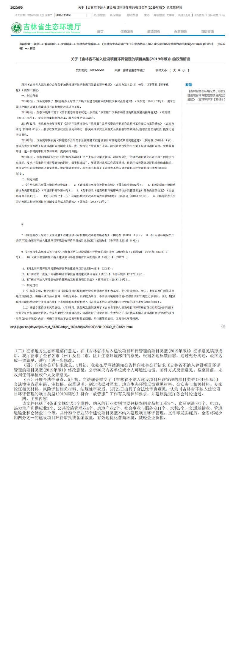 【解读】关于《吉林省不纳入建设项目环评管理的项目类型(2019年版)》的政策解读