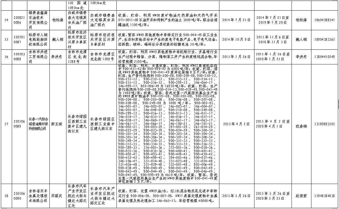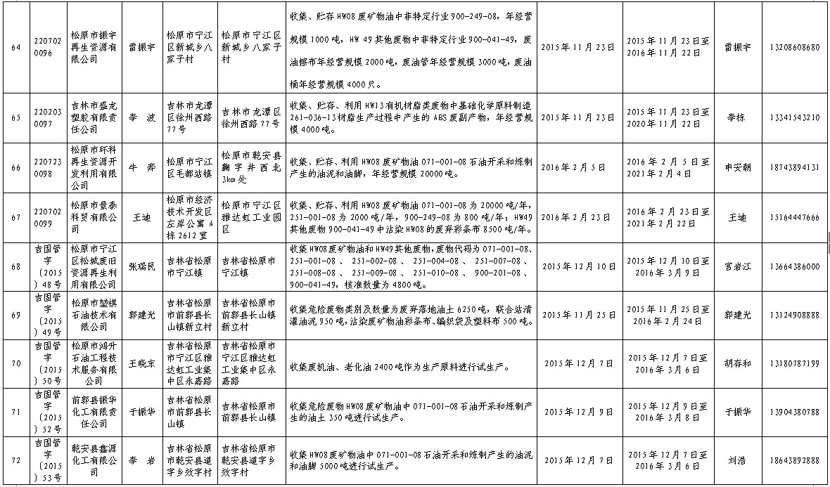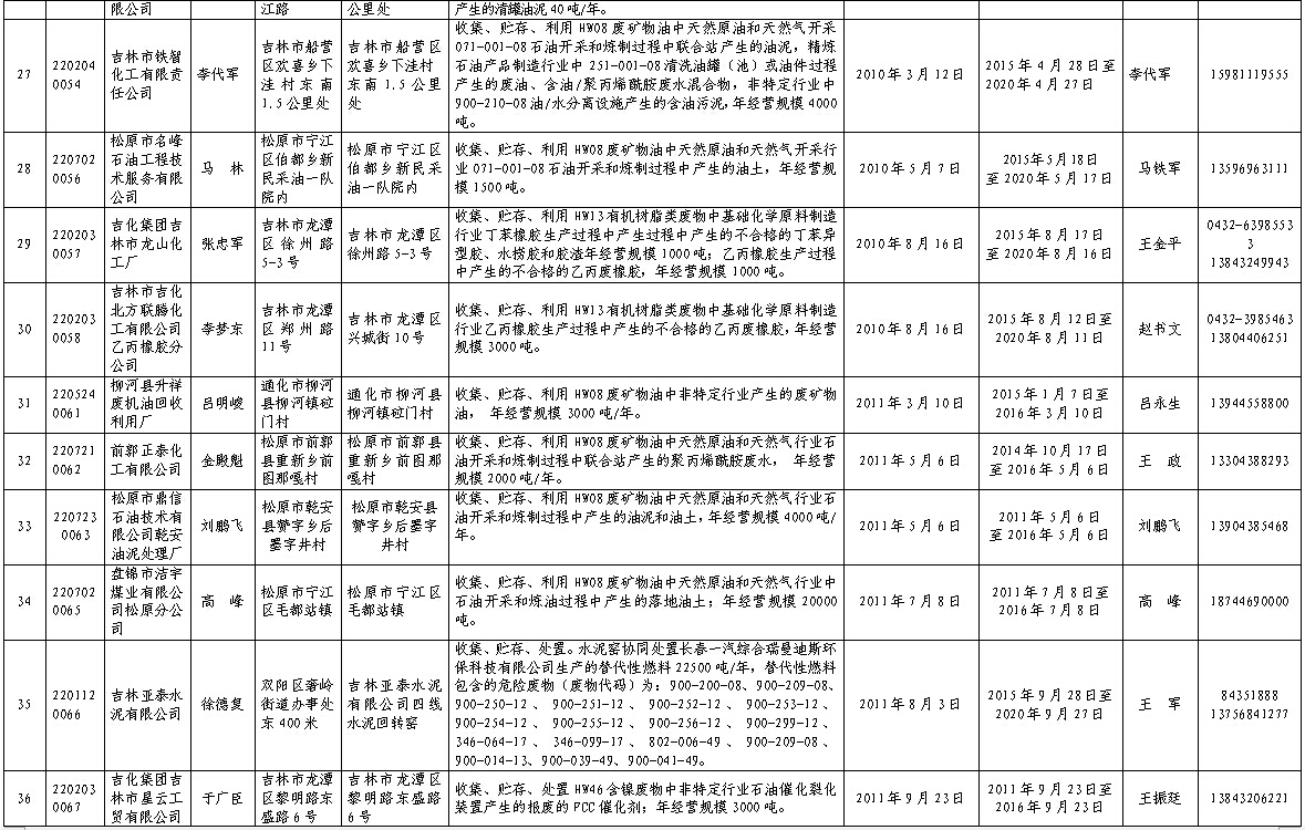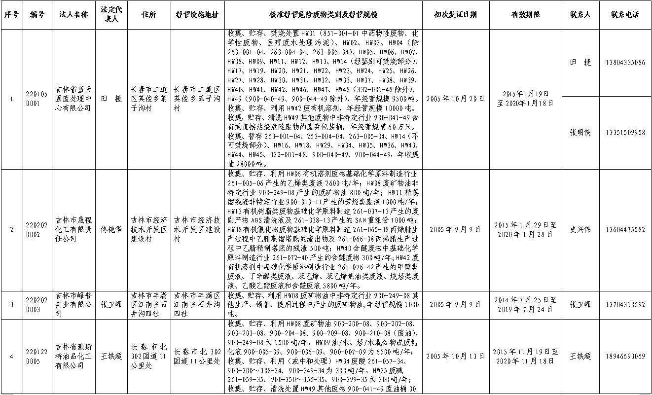 吉林省危险废物经营许可证持证企业名单(2016年2月更新)
