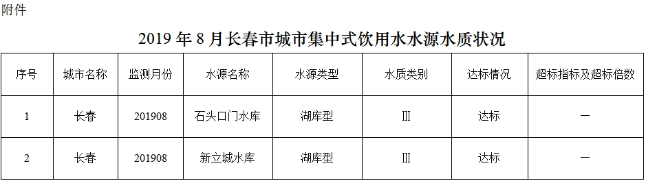 2019年8月,两个在用集中式饮用水水源水质均达到地表水Ⅲ类标准,达标率100%。