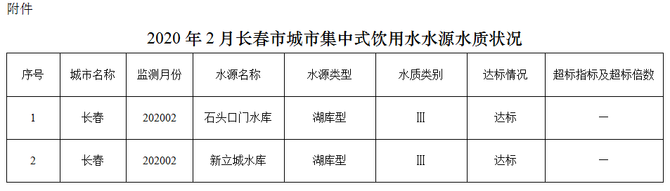2020年2月,两个在用集中式饮用水水源水质均达到地表水Ⅲ类标准,达标率100%。