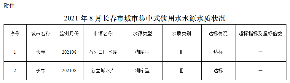2021年8月,两个在用集中式饮用水水源水质均达到地表水Ⅲ类标准,达标率100%。