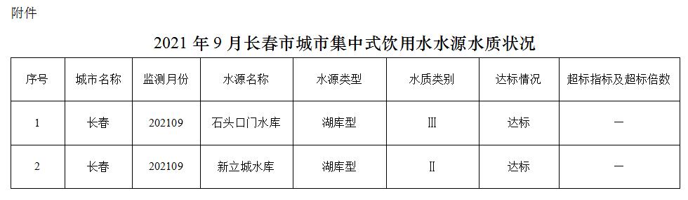2021年9月,两个在用集中式饮用水水源水质均达到地表水Ⅲ类标准,达标率100%。
