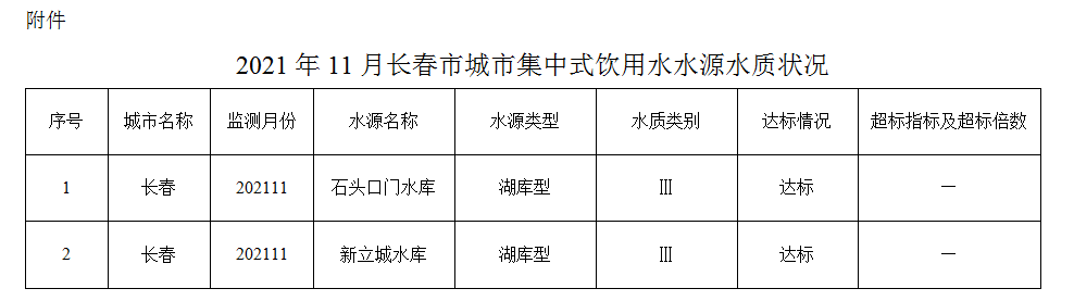 2021年11月,两个在用集中式饮用水水源水质均达到地表水Ⅲ类标准,达标率100%。