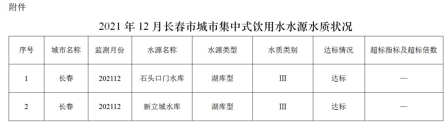 2021年12月,两个在用集中式饮用水水源水质均达到地表水Ⅲ类标准,达标率100%。