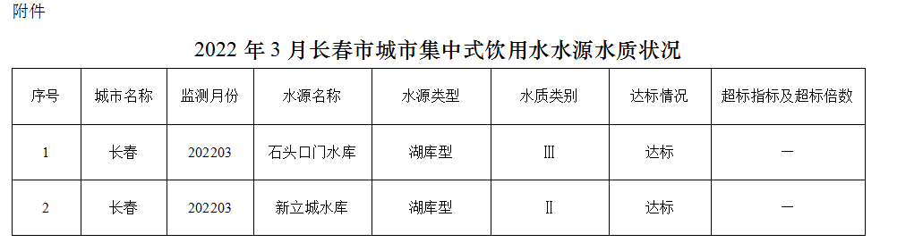 2022年3月,两个在用集中式饮用水水源水质均达到地表水Ⅲ类标准,达标率100%。