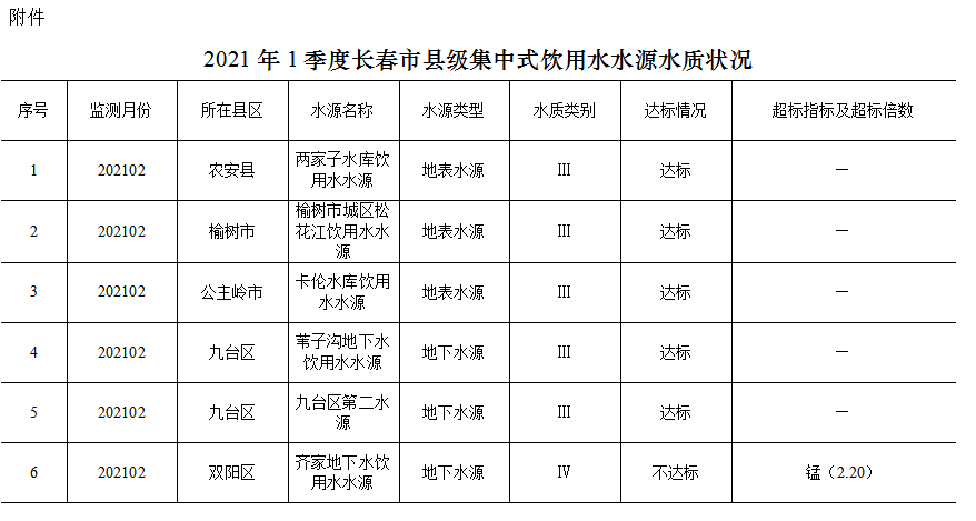 2021年1季度,全市监测的6个县级集中式生活饮用水水源地中,5个达标(达到或优于Ⅲ类标准),1个超标。其中农安县两家子水库饮用水水源、榆树市城区松花江饮用水水源、公主岭市卡伦水库饮用水水源、九台区苇子沟地下水饮用水水源和九台区第二水源为Ⅲ类水质;双阳区齐家地下水饮用水水源为Ⅳ类水质,主要超标指标为锰,其原因为固有本底较高导致,双阳区通过二氧化氯、铁锰筛等设施降低铁、锰含量,目前双阳区已基本完成了本底判定工作,同时已启动新水源的替换工作。