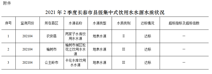 2021年2季度,全市监测的3个县级地表水饮用水源均达标(达到或优于Ⅲ类标准)。其中农安县两家子水库饮用水水源为Ⅱ类水质;榆树市城区松花江饮用水水源和公主岭市卡伦水库饮用水水源为Ⅲ类水质。