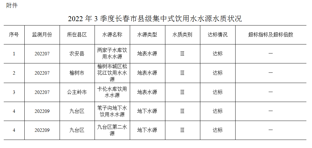 2022年3季度,全市监测的5个县级集中式生活饮用水水源地均达标(达到或优于Ⅲ类标准)。其中农安县两家子水库饮用水水源、榆树市城区松花江饮用水水源、公主岭市卡伦水库饮用水水源、九台区苇子沟地下水饮用水水源和九台区第二水源均为Ⅲ类水质。