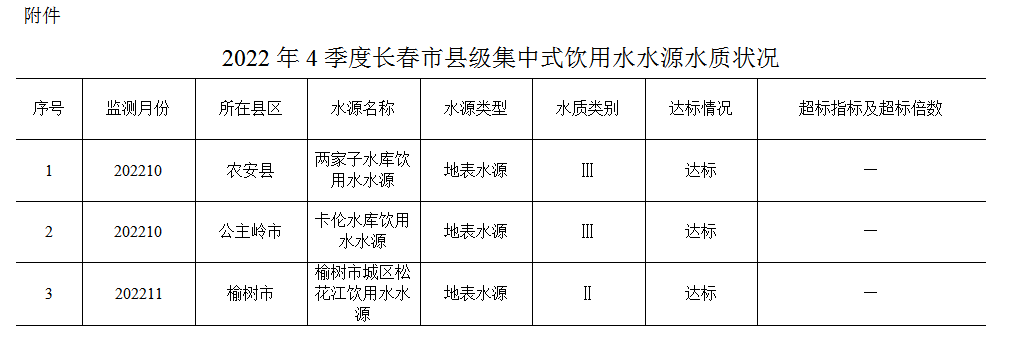 2022年4季度,全市监测的3个县级地表水饮用水源均达标(达到或优于Ⅲ类标准)。其中榆树市城区松花江饮用水水源为Ⅱ类水质,农安县两家子水库饮用水水源和公主岭市卡伦水库饮用水水源为Ⅲ类水质。