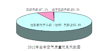 在全年366天中,城区空气质量达到Ⅰ级(优)天数78天,Ⅱ级(良)261天,优、良天气之和占总天数的92.6%,Ⅲ级(轻微污染)以上天数为27天,仅占总天数的7.4%。空气质量Ⅲ级(轻微污染)天气主要分布在冬季采暖期和春季大风期,空气质量Ⅰ级(优)主要分布在夏、秋两季。