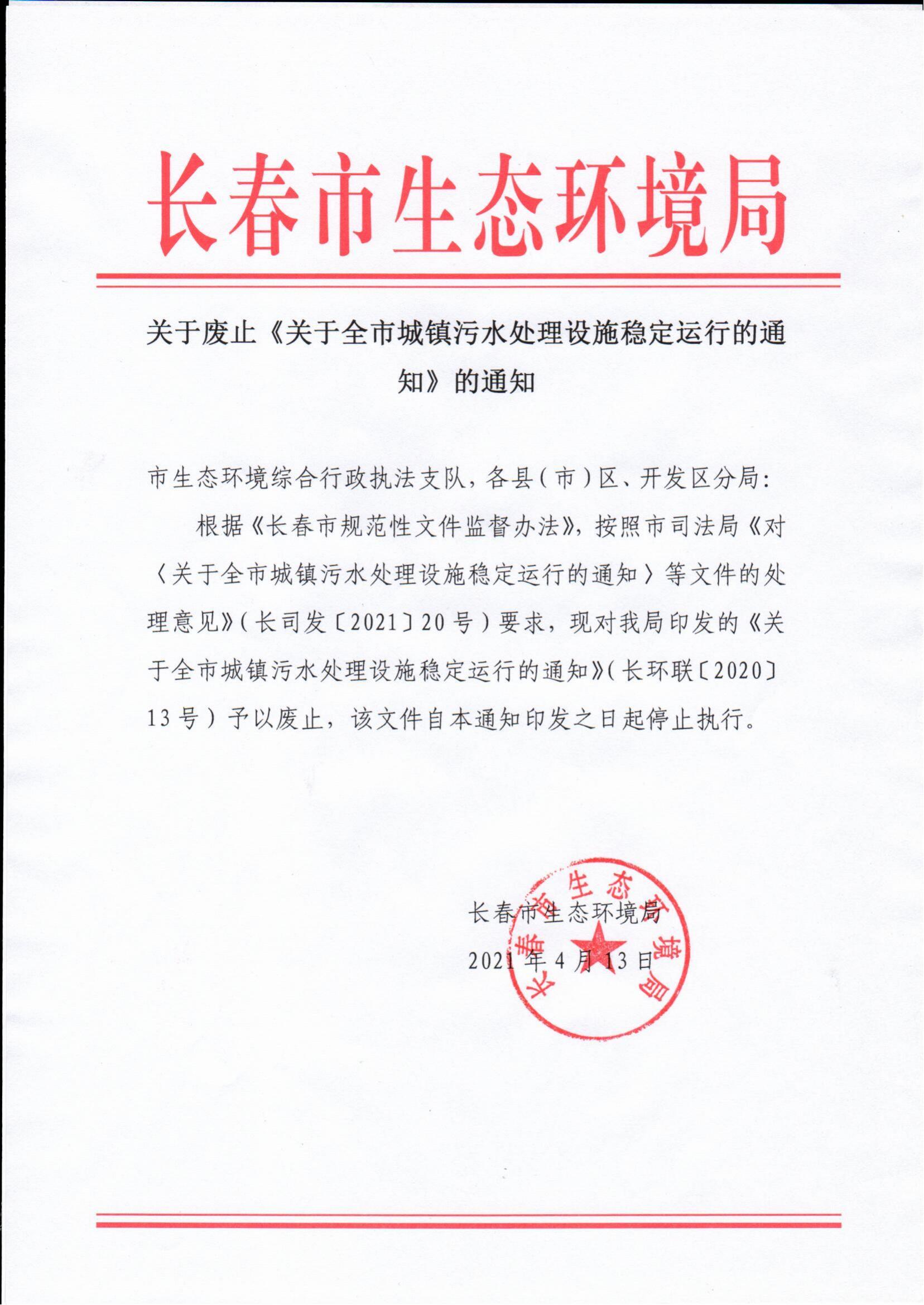 关于废止《关于全市城镇污水处理设施稳定运行的通知》的通知