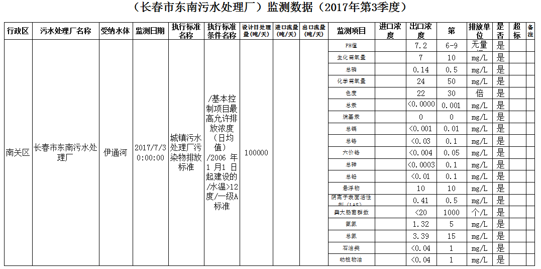 (十大正规网赌平台东南污水处理厂)监测数据(2017年第3季度)