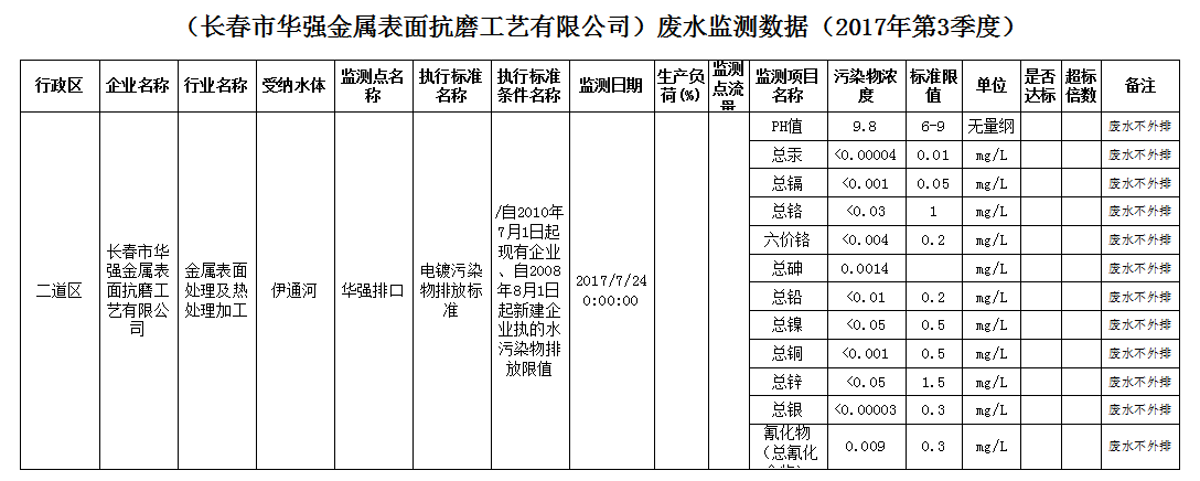 (网赌平台华强金属表面抗磨工艺有限公司)废水监测数据(2017年第3季度)