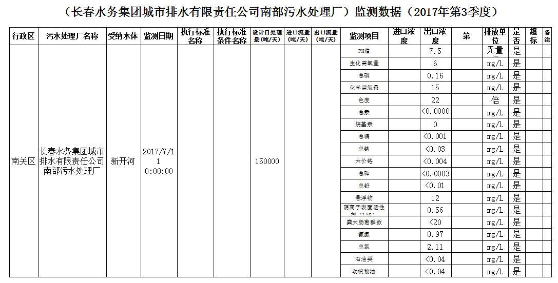 (长春水务集团城市排水有限责任公司南部污水处理厂)监测数据(2017年第3季度)