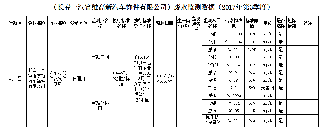 (长春一汽富维高新汽车饰件有限公司)废水监测数据(2017年第3季度)