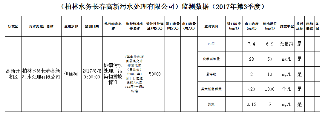 (柏林水务长春高新污水处理有限公司)监测数据(2017年第3季度)