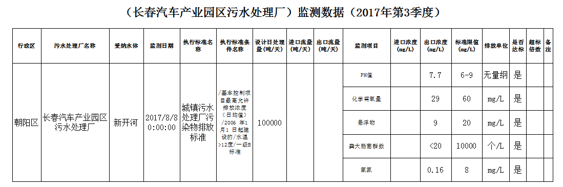 (长春汽车产业园区污水处理厂)监测数据(2017年第3季度)