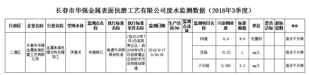 十大正规网赌平台华强金属表面抗磨工艺有限公司废水监测数据(2018年3季度)