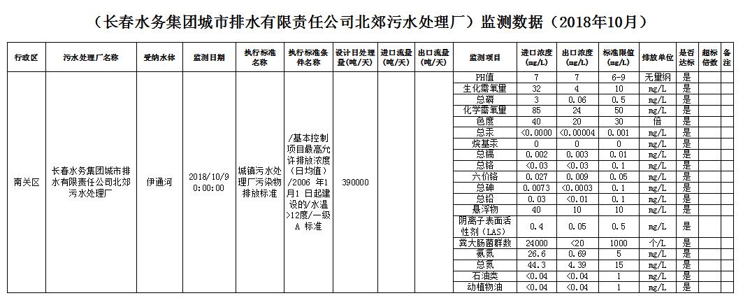 (长春水务集团城市排水有限责任公司北郊污水处理厂)监测数据(2018年10月)