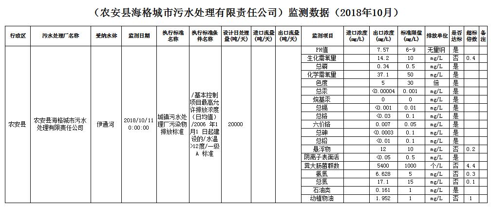 (农安县海格城市污水处理有限责任公司)监测数据(2018年10月)