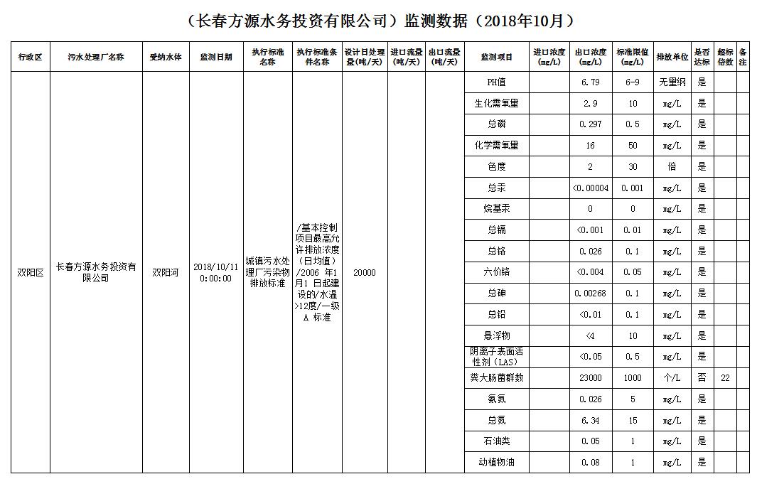 (长春方源水务投资有限公司)监测数据(2018年10月)