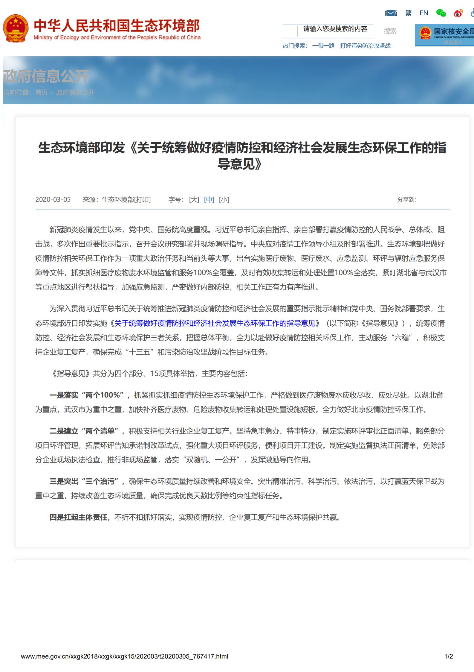 【解读】生态环境部印发《关于统筹做好疫情防控和经济社会发展生态环保工作的指导意见》