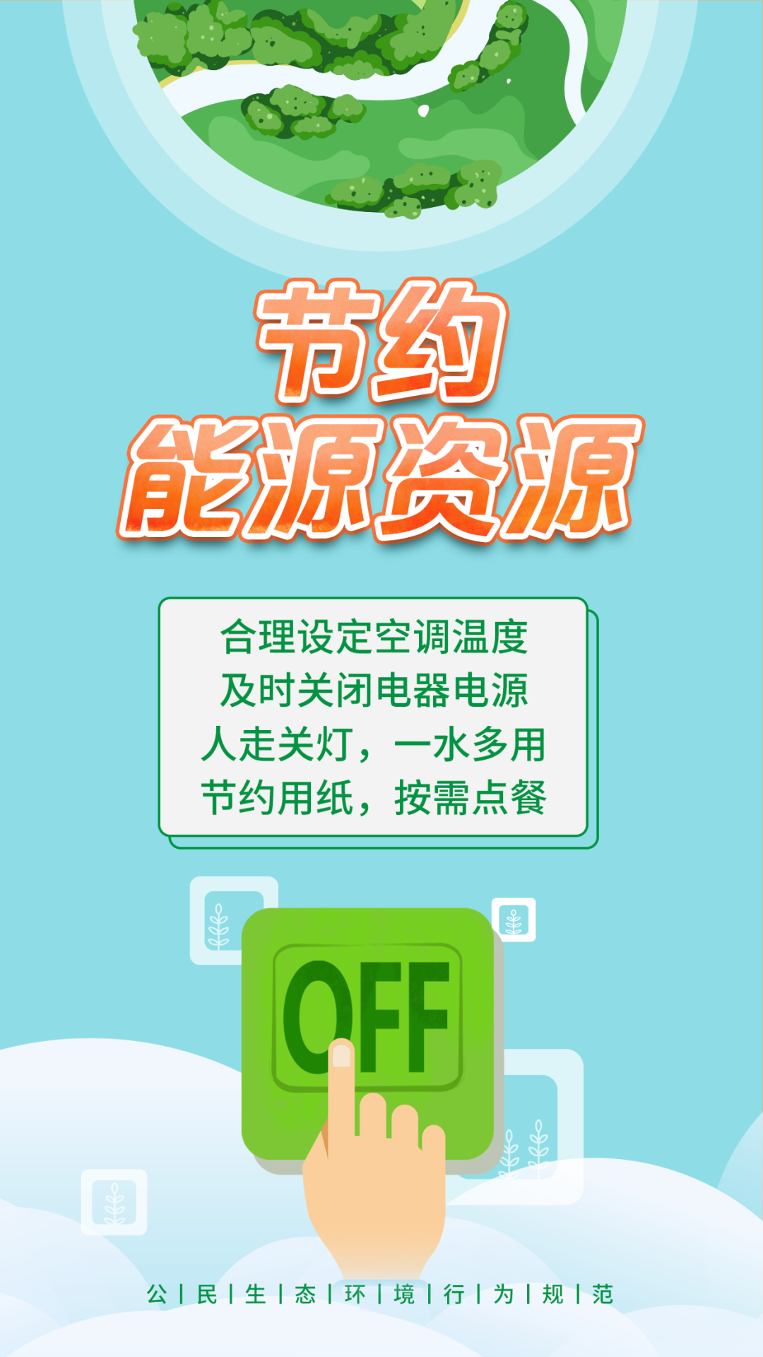 第二条 节约能源资源。合理设定空调温度,夏季不低于26度,冬季不高于20度,及时关闭电器电源,多走楼梯少乘电梯,人走关灯,一水多用,节约用纸,按需点餐不浪费。
