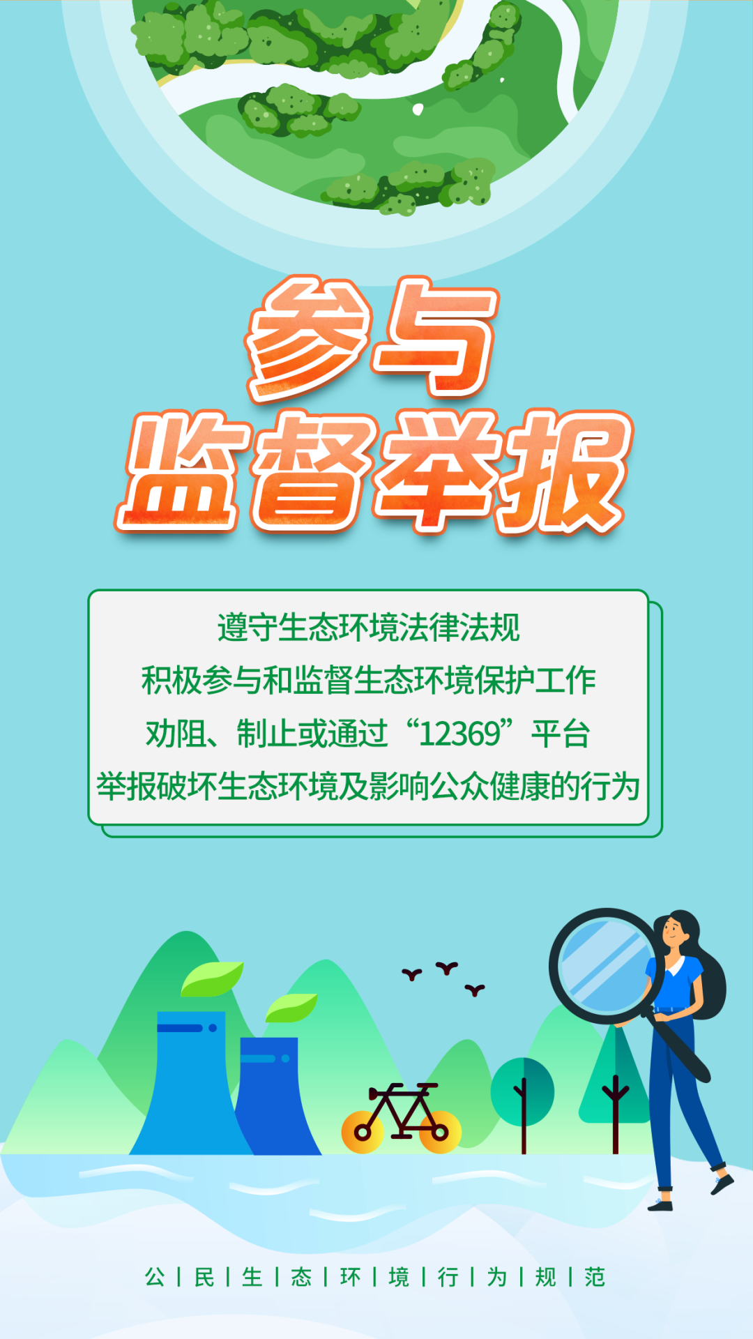 第九条 参与监督举报。遵守生态环境法律法规,履行生态环境保护义务,积极参与和监督生态环境保护工作,劝阻、制止或通过“12369”平台举报破坏生态环境及影响公众健康的行为。