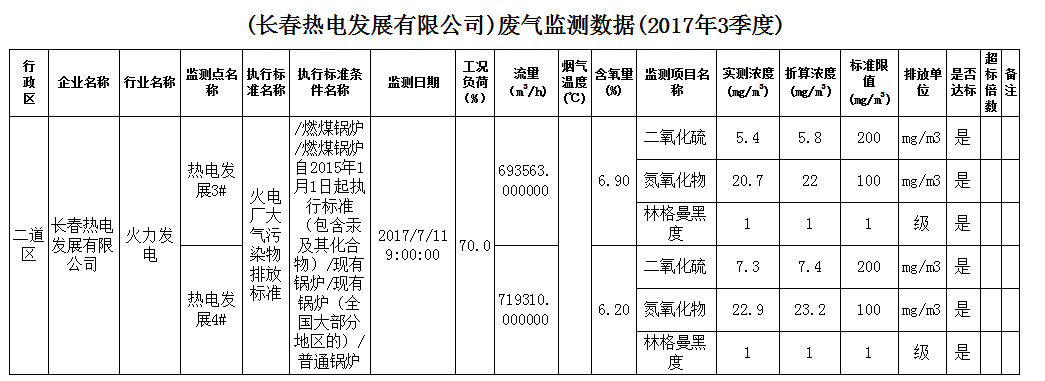 (长春热电发展有限公司)废气监测数据(2017年3季度)
