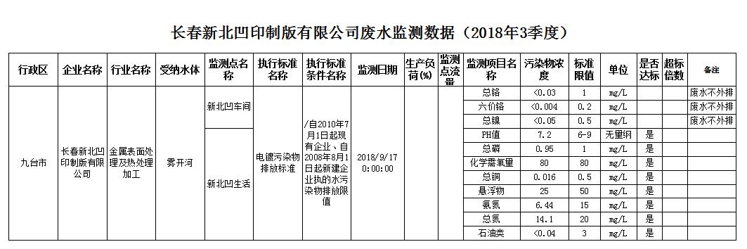 长春新北凹印制版有限公司废水监测数据(2018年3季度)