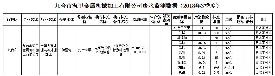 九台市海甲金属机械加工有限公司废水监测数据(2018年3季度)