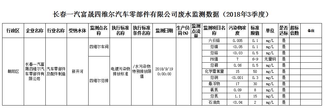 长春一汽富晟四维尔汽车零部件有限公司废水监测数据(2018年3季度)