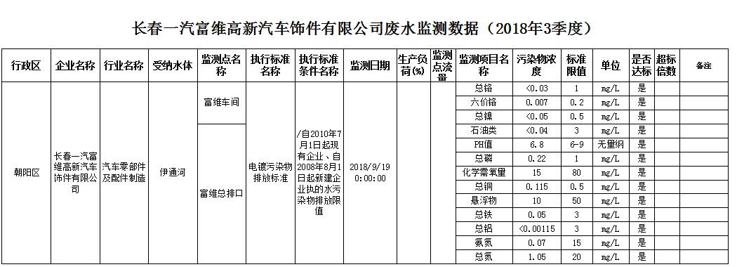 长春一汽富维高新汽车饰件有限公司废水监测数据(2018年3季度)